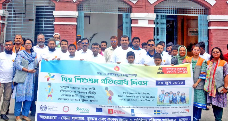 খুলনা, ০৫ আষাঢ় (১৯ জুন) : বিশ্ব শিশুশ্রম প্রতিরোধ দিবস উপলক্ষ্যে আলোচনা সভা আজ (বৃহস্পতিবার) দুপুরে খুলনা জেলা প্রশাসকের সম্মেলনকক্ষে অনুষ্ঠিত হয়। এতে প্রধান অতিথি ছিলেন অতিরিক্ত জেলা ম্যাজিস্ট্রেট দীপংকর দাশ। দিবসের এবারের প্রতিপাদ্য ‘স্বপ্নের ডানায় ভর করি, শিশুশ্রমের শৃঙ্খল ছিঁড়ি, এগিয়ে চলি দৃপ্ত পায়ে, আশার আগুণ বুকে জ¦ালি’।