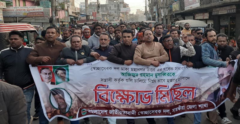নিজস্ব প্রতিনিধি : স্বেচ্ছাসেবক দল ঢাকা মহানগর উত্তর এর সাবেক সাধারণ সম্পাদক আজিজুর রহমান মুসাব্বিরকে সন্ত্রাসী কর্তৃক গুলি চালিয়ে নির্মমভাবে হত্যার প্রতিবাদে সাতক্ষীরায় বিক্ষোভ মিছিল ও প্রতিবাদ সমাবেশ করেছে বাংলাদেশ জাতীয়তাবাদী স্বেচ্ছাসেবক দল সাতক্ষীরা জেলা শাখা। শনিবার (১০ জানুয়ারী) বিকালে সাতক্ষীরা শহরের পরিবহন কাউন্টারের সামনে থেকে একটি বিক্ষোভ মিছিল বের হয়ে শহরের গুরুত্বপূর্ণ সড়ক প্রদক্ষিণ শেষে চায়না বাংলার সামনে গিয়ে একটি বিক্ষোভ সমাবেশ করে।