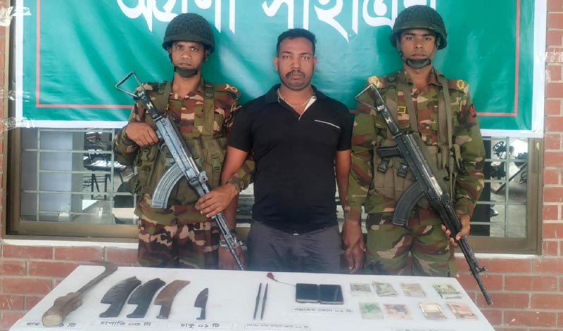 হাফিজুর রহমান শিমুল : সাতক্ষীরার কালিগঞ্জে সেনাবাহিনীর অভিযানে দেশীয় অস্ত্র ও বিভিন্ন দেশের মুদ্রারসহ আবু হাসান রাজু (৩২) নামের এক যুবককে আটক করা হয়েছে। (২৫ মার্চ) মঙ্গলবার গভীর রাতে কালিগঞ্জের পাউখালী সেনা ক্যাম্পের একটি আভিযানিক দল উপজেলার মথুরেশপুর ইউনিয়নের চরযমুনা এলাকায় অভিযান চালিয়ে তাকে আটক করেন। আটক আবু হাসান রাজু উপজেলার মথুরেশপুর ইউনিয়নের চরযমুনা গ্রামের কামাল হোসেনের ছেলে।