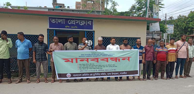 মানব বন্ধনে বক্তব্য রাখেন বাংলাদেশ কেমিস্ট এন্ড ড্রাগিস্ট সমিতি কেমিস্ট এন্ড ড্রাগিস্ট সমিতি তালা উপজেলার সাবেক সভাপতি ও আবিরোন ফার্মেসীর মালিক আনিছুর রহমান, বর্তমান সাধারণ সম্পাদক জাকারিয়া, মিজানুর রহমান সহ আরও অনেকে। বক্তারা বলেন চিকিৎসা হচ্ছে মানুষের চারটি মৌলিক চাহিদার একটি। আর এই জীবন রক্ষাকারী ঔষধ উৎপাদন, বিপনন ও সরবরাহের ক্ষেত্রে আমাদের দাবীগুলো বাস্তবায়ন অত্যান্ত গুরুত্বপূর্ণ ও যৌক্তিক। অবিলম্বে এই চার দফা দাবী পূরণের জন্য কর্তৃপক্ষের নিকট জোর দাবী জানাচ্ছি।