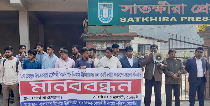 রবিবার (১ফেব্রুয়ারি) সকালে বাংলাদেশ ডিপ্লোমা ইঞ্জিনিয়ারিং ছাত্র-শিক্ষক পেশাজীবী সংগ্রাম পরিষদ সাতক্ষীরা জেলা শাখার আয়োজনে সাতক্ষীরা প্রেসক্লাবের সামনে সংগঠনের যুগ্ন আহবায়ক ও পাউবোর উপ বিভাগীয় প্রকৌশলী মো. রাশিদুল ইসলামের সভাপতিত্বে আলোচনা সভা ও মানববন্ধন কর্মসূচীতে প্রধান অতিথি হিসেবে বক্তব্য রাখেন আইডিইবি জেলা শাখার সাধারণ সম্পাদক ও শিক্ষা প্রকৌশল অধিদপ্তর সাতক্ষীরার সহকারি প্রকৌশলী এম. এম. এ আবু জায়েদ বিন গফুর।