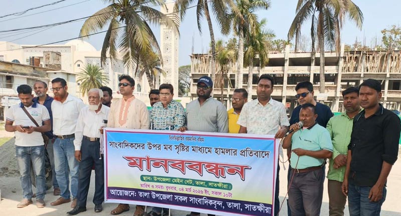 তালা প্রেসক্লাবের সভাপতি এম এ হাকিমের সভাপতিত্বে ও তালা উপজেলা প্রেসক্লাবের সভাপতি আকবর হোসেনের সঞ্চালনায় মানববন্ধনে বক্তব্য রাখেন, তালা প্রেসক্লাবের সাধারণ সম্পাদক ফারুক হেসেন জোয়ারদার, তালা প্রেসক্লাবের সহ-সভাপতি এম এ ফয়সাল, পাটকেলঘাটা প্রেসক্লাবের সভাপতি আব্দুল মমিন, তালা উপজেলা প্রেসক্লাবের সহ-সভাপতি সাইদুর রহমান, পাটকেলঘাটা প্রেসক্লাবের অর্থ সম্পাদক আতাউর রহমান, সাংবাদিক শেখ মখফুর রহমান জান্টু, আব্দুল মতিন, সাতক্ষীরা প্রেসক্লাবের সদস্য সানজিদুল হক ইমন, নাজমুল হাসান প্রমুখ।