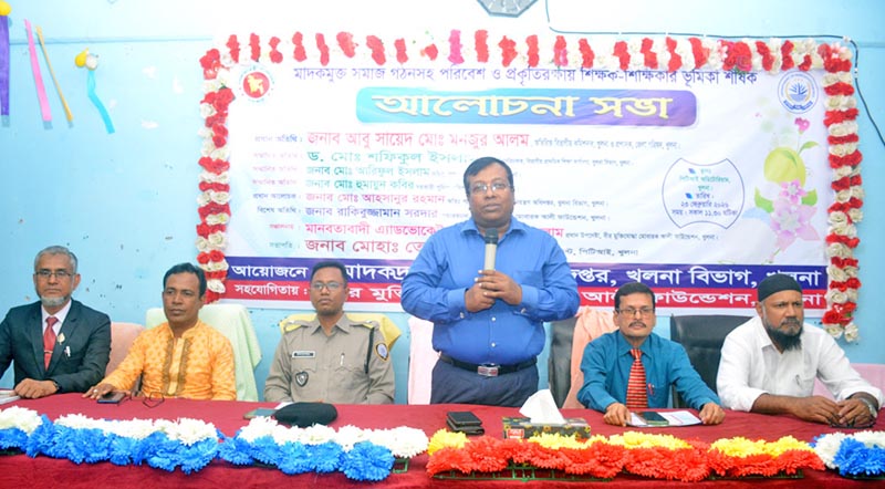 খুলনা, ফাল্গুন ১০ (২৩ ফেব্রুয়ারি) : ‘মাদকমুক্ত সমাজ গঠনসহ পরিবেশ ও প্রকৃতিরক্ষায় শিক্ষক-শিক্ষিকার ভূমিকা শীর্ষক’ আলোচনা সভা আজ (সোমবার) খুলনা পিটিআই অডিটোরিয়ামে অনুষ্ঠিত হয়। সভায় প্রধান অতিথি ছিলেন অতিরিক্ত বিভাগীয় কমিশনার (সার্বিক) আবু সায়েদ মো: মনজুর আলম। বীর মুক্তিযোদ্ধা মোবারক আলী ফাউন্ডেশনের সহযোগিতায় খুলনা মাদকদ্রব্য নিয়ন্ত্রণ অধিদপ্তর এ অনুষ্ঠানের আয়োজন করে।