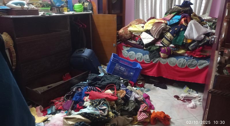 ভিতরের সকল ঘরের দরজার তালা ভাঙা। ঘরের আলমারি ও পোশাক আলমারি ভেঙে সমস্ত জিনিসপত্র ঘরের মধ্যে তছনছ করে ফেলে রাখা। দুর্বৃত্তরা ঘরের আলমারিতে রাখা ট্রাক বিক্রির নগদ ৮ লাখ টাকা এবং ৪০ ভরি স্বর্ণালংকারসহ প্রায় এক কোটি টাকারও বেশি মূল্যের মালামাল চুরি করে নিয়ে গেছে।
