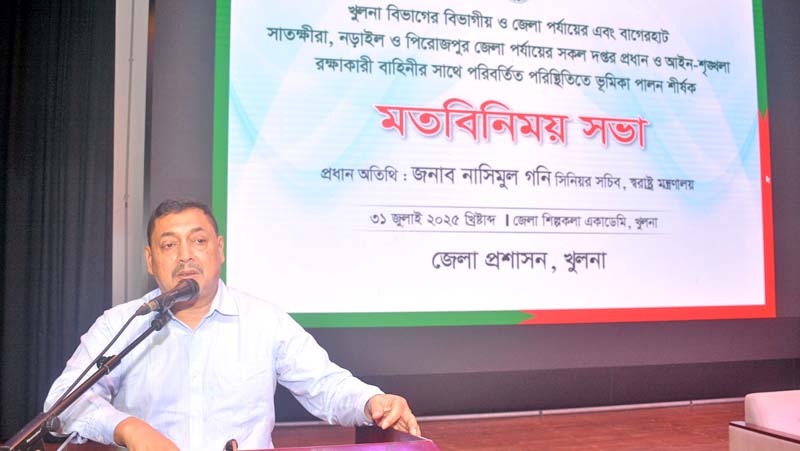 খুলনা, ১৬ শ্রাবণ (জুলাই ৩১) :খুলনা বিভাগীয় পর্যায়ের এবং খুলনা, বাগেরহাট, সাতক্ষীরা, নড়াইল ও পিরোজপুর জেলার সকল দপ্তর প্রধান ও আইনশৃঙ্খলা রক্ষাকারী বাহিনীর কর্মকর্তাদের সাথে পরিবর্তিত পরিস্থিতিতে ভূমিকা পালন শীর্ষক মতবিনিময় সভা আজ (বৃহস্পতিবার) সন্ধ্যায় খুলনা জেলা শিল্পকলা একাডেমি অডিটোরিয়ামে অনুষ্ঠিত হয়। মতবিনিময় সভায় প্রধান অতিথি ছিলেন স্বরাষ্ট্র মন্ত্রণালয়ের জননিরাপত্তা বিভাগের সিনিয়র সচিব নাসিমুল গনি।